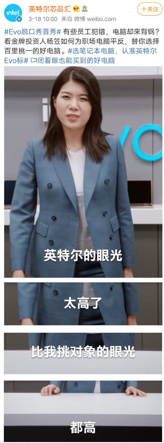 在眾多吐槽之下,英特爾把楊笠代言的這條微博給刪了。