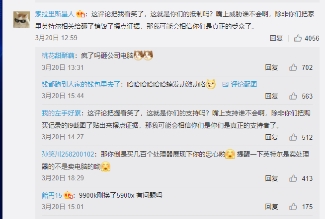 事實上現在去英特爾微博評論區看看,除了這樣經典對罵的: