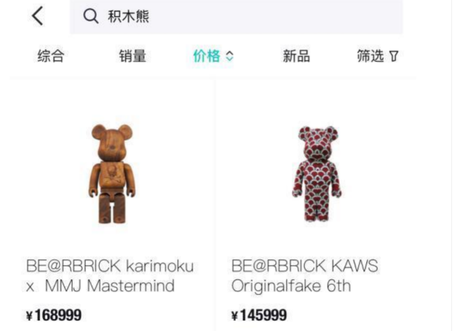 積木熊分為多種規格,其中1000%規格(約70cm)頗受歡迎,國內發售價平均在3500元到4000元之間,然而運氣好的話倒賣一隻也可賺到數萬,甚至在某交易平台最高價格一度接近17萬。