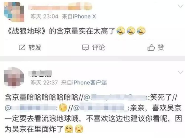 對沈騰的形容並非首創,形容吳京的“含京量”也曾風靡一時。但與“含騰量”不同,“含京量”並非一件單純的好事。對喜愛吳京的觀眾,“含京量”高能促使他們購票,但對於牴觸吳京的觀眾而言,“含京量”高反倒成為觀影決策的勸退因素。