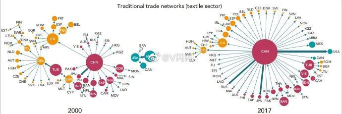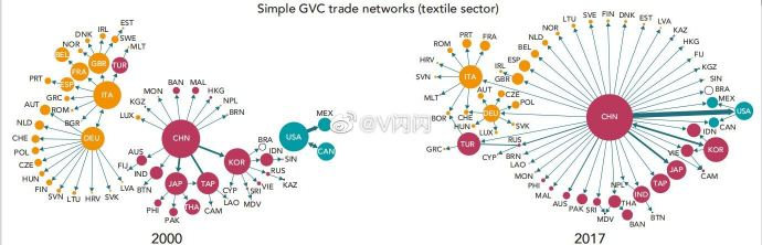 因為中國紡織業發展顛覆性的改變了全世界的相關領域的產業鏈解構,從本世紀初,也就是2000年的全球區域紡織業中心,到2017年,變成了世界唯一的紡織業中心。