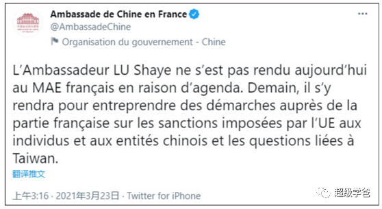 盧沙野順勢乳了一下法,表示我今天沒空,明天也沒空。因為明天我要去法國外交部,就歐盟對中國個人、實體的制裁決定和台灣問題向法國提出交涉。