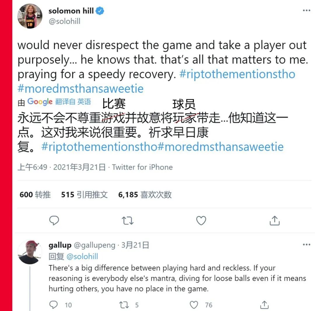 索羅門·希爾過分魯莽的搶斷,也遭遇各路指責,給他帶來極大的壓力,尤其是哈雷爾賽後的指責,促使他趕緊到推特上為自己辯解。我相信索羅門·希爾不會是故意的,但他的動作又讓一位MVP競爭者離開了賽場,幾位最初的熱門中,杜蘭特、恩比德、庫裏都缺陣不短的時間。