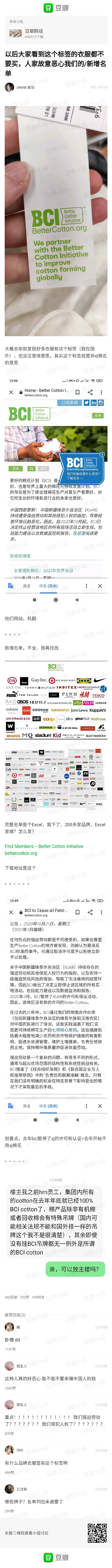 更嚴重的是,H&M並不是個例,優衣庫等一堆國際品牌紛紛加入其中,甚至發明了一個“BCI標籤”,字面意思為“更好的棉花計劃”,事實上就是“非新疆棉花”。
