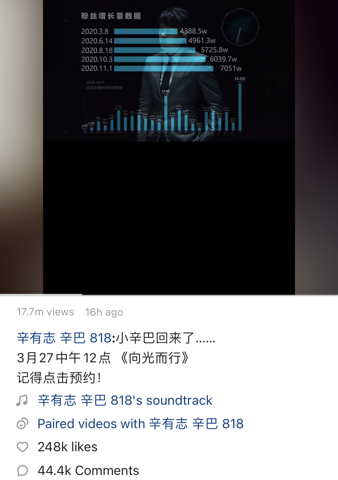 在另一段視頻中,辛有志預告27日中午的直播主題為《向光而行》,向粉絲深情告白,稱“你們的聲音,我聽到了,你們的留言,我看見了”。