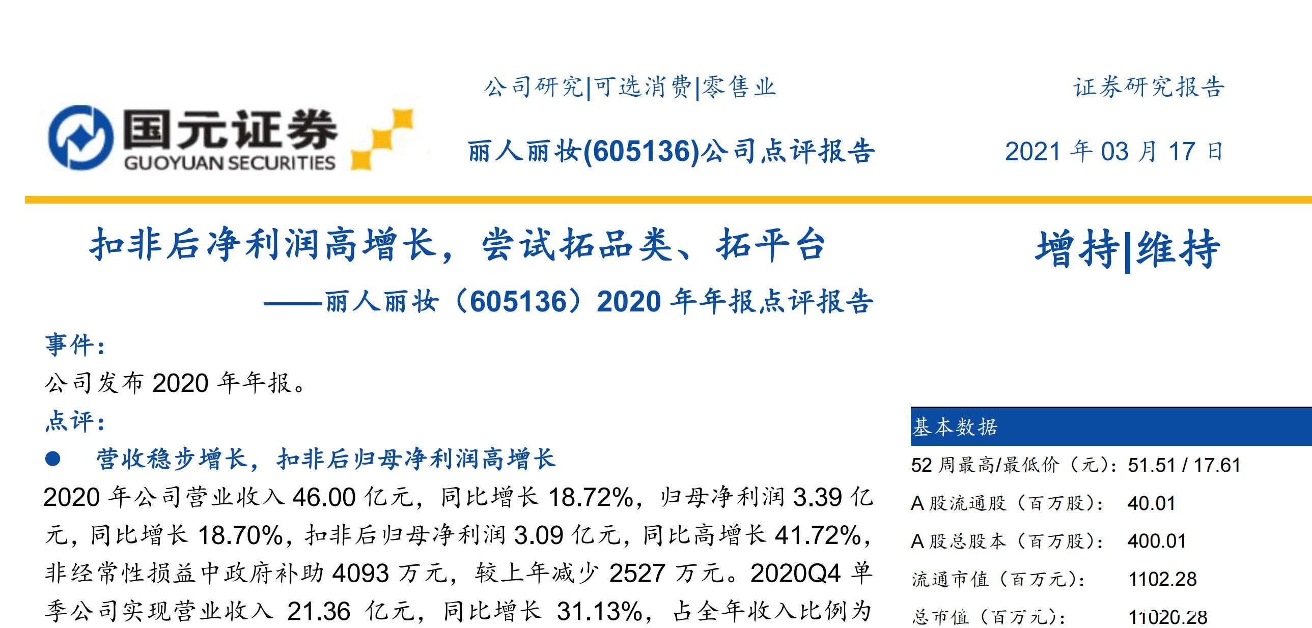 對此,國元證券也同時發佈報告表示,“維持麗人麗妝增持評級,預計公司2021/2022/2023年EPS分別為1.03/1.16/1.29元/股,對應PE分別27x、24x、21x”。