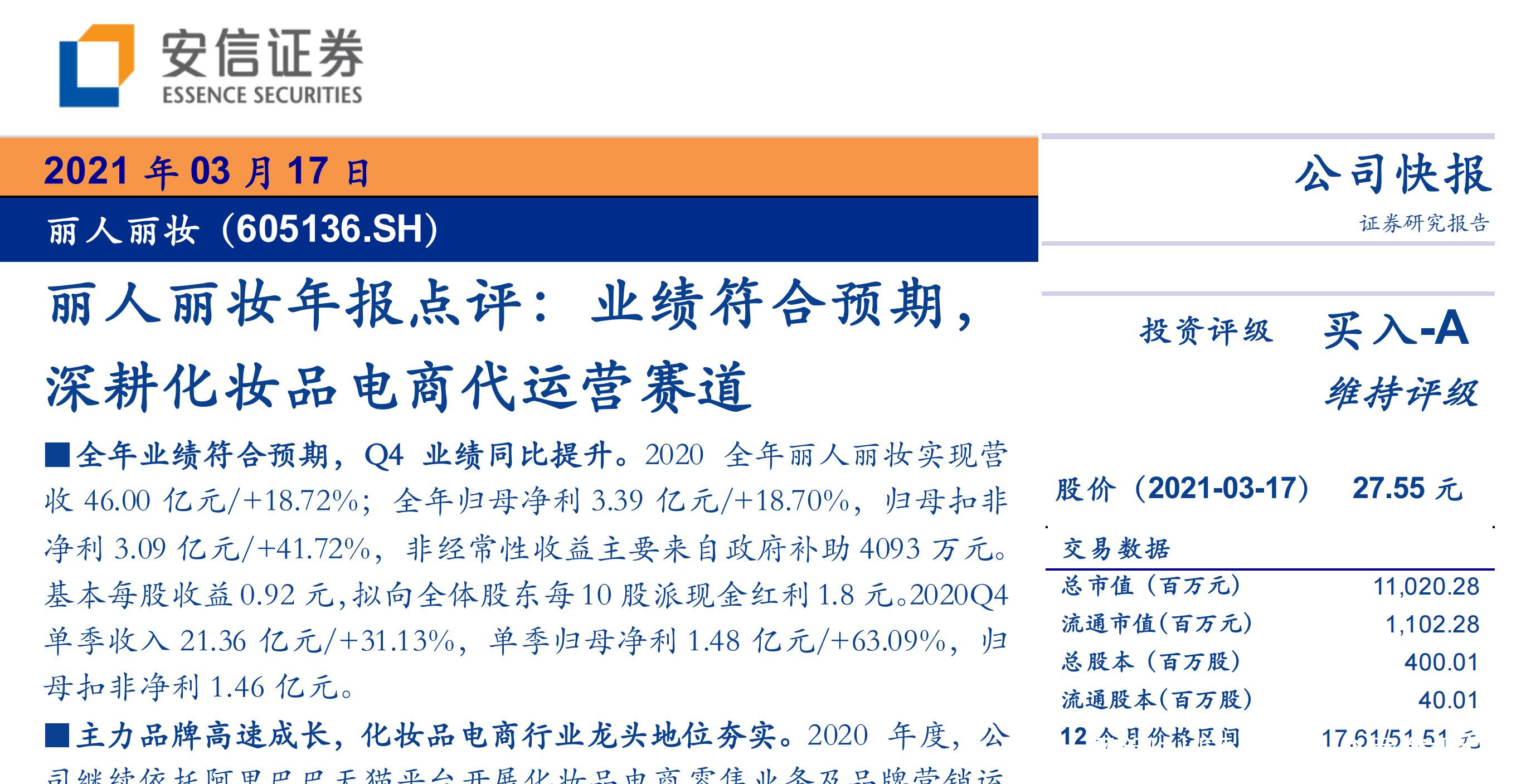 麗人麗妝發佈財報後,安信證券在其相關研報當中點評為,“業績符合預期,深耕化妝品電商代運營賽道。對其維持買入-A 投資評級。公司深耕美妝垂直行業,行業壁壘、 頭部效應顯現;預計公司 2021-2023 年營收為 53.4 億元/63.1 億元/75.8 億元,對應增速 +16.2%/+18.1%/+20.2%;對應整淨利潤為 3.9 億元/4.7 億元/5.7 億元。”