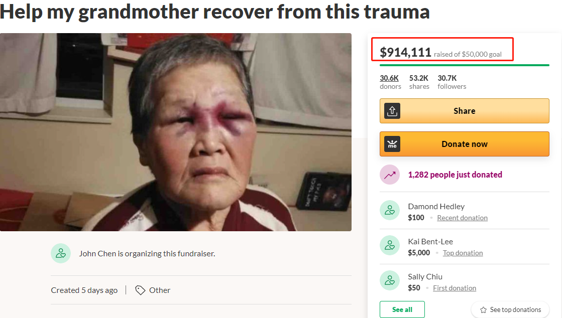 陳德和22日稱,截至當日,籌款已近89萬美元,估計網站要扣除一小部分手續費。再加上後續也要針對白人嫌犯採取法律行動,扣掉相應費用,其他的打算全部捐出去給社區機構,用於反歧視、反暴力行動。此外,他和太太還決定另捐1萬美元。至於岳母後續的治療費用,他會想辦法籌集。