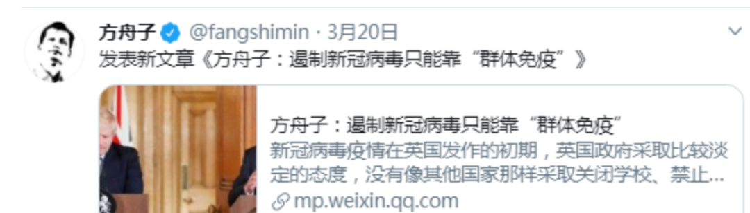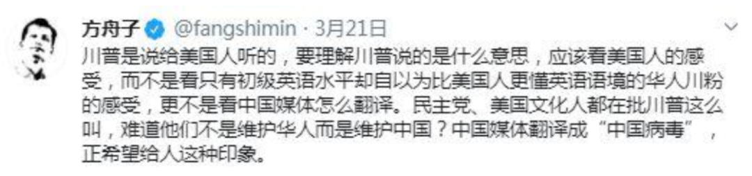 甚至在特朗普滿口“中國病毒”,造成美國民眾仇恨亞裔風潮的時候,方舟子依然堅定地給特朗普的言論洗地。按照方舟子的説法,特朗普改成“中國病毒”是“中國的病毒”或者是“華人病毒”的意思,所以並沒有什麼不妥,是中國媒體翻譯在誤導大眾。所以,美國的仇華風潮不怪特朗普,怪中國媒體?