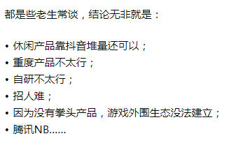 那麼哪些廠商會滿足字節跳動的需求呢?那就得先來看看字節跳動缺的是什麼東西了。其實從多篇分析文中我們可以看到,字節跳動雖然已經有幾年的時間説着要殺入遊戲圈,但是卻一直沒有一個能夠拿出來當門面的作品,原因也被不少網友總結了,在知乎上經緯中國副總裁莊明浩就總結出來了這幾點:
