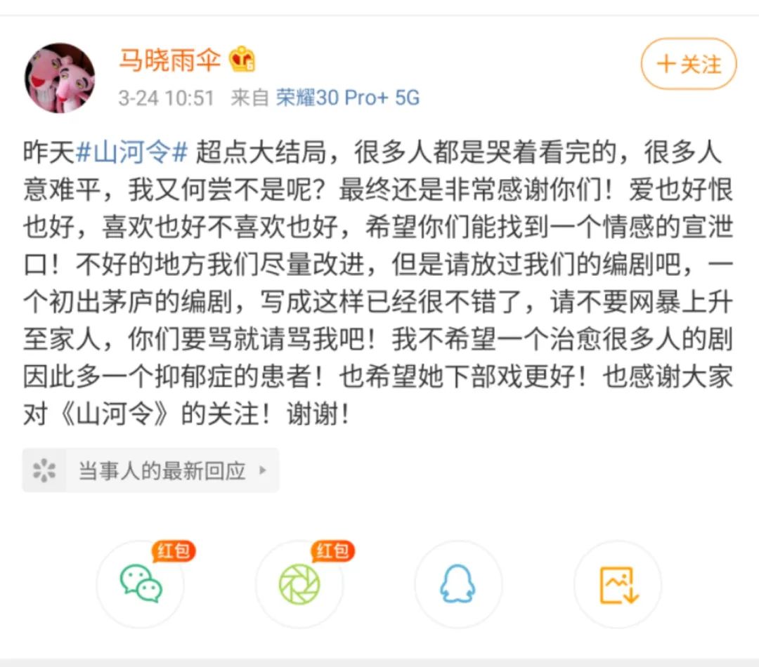 走向越來越負面,越演越烈,今天下午,該劇總製片人馬韜@馬曉雨傘下場發博稱求放過編劇。