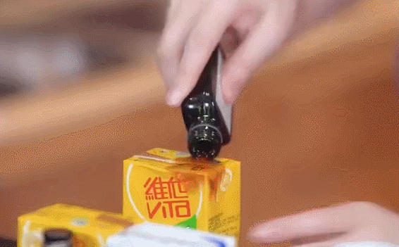 首先準備一把剪刀,把紙盒裝茶飲剪開一個口子,然後再倒出一部分飲料,接着再把已經準備好的小瓶裝基酒扭開,倒插進剛剛剪開的口子裏,就可以得到一杯“打吊瓶”的雞尾酒。