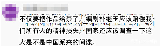 還有網友稱,建議當局查一下電視劇的編劇樸繼玉是不是中國派來的“間諜”。尤其是在韓媒稱,樸繼玉曾和中國杭州一影視公司簽署了創作協議(該消息已闢謠)後,樸繼玉被懷疑和中國的朝鮮族有關係。