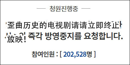 在媒體的推波助瀾下,次日(23日),就有韓國網友直接上青瓦台請願網站請願,希望該電視劇終止放映。截至發稿,已經有超過20萬韓國網友參與請願。