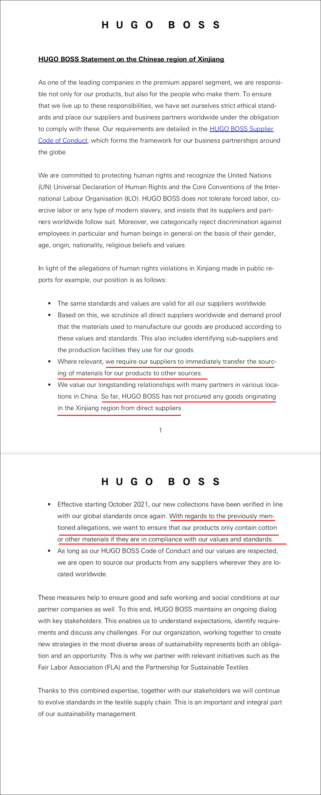 在聲明中,雨果博斯官方空口白話,含糊其辭地寫道:“根據相關情況,我們要求我們的供應商立即將我們產品的原材料採購轉移到其他來源地。”