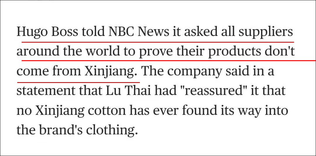 去年9月,雨果博斯官方接受美國媒體NBC採訪時稱,他們要求世界各地的供應商證明他們的產品不是來自新疆。