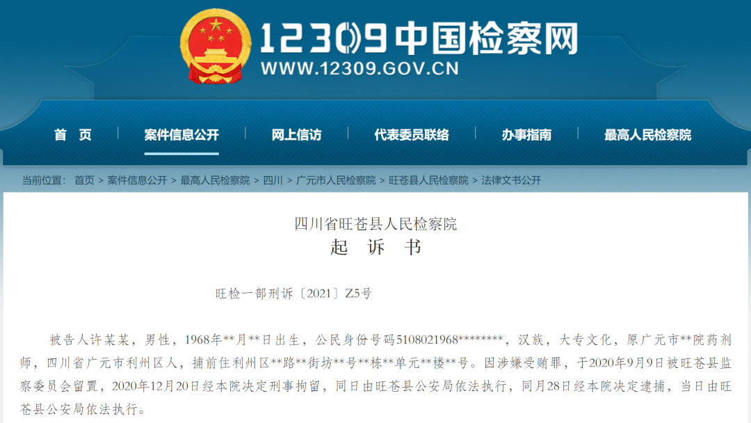 近日,四川省旺蒼縣人民法院對兩名藥劑師提起公訴。這二人此前都在廣元市中心醫院供職,因涉嫌受賄罪於2020年9月起接受調查。
