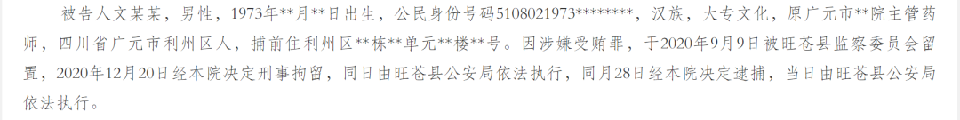 儘管起訴書未披露二人的名字,但通過廣元市紀委發佈的消息可以確定,涉案的正是廣元市中心醫院藥學部藥劑師許豐和靜脈用藥配置中心主任文陽。這二人於2020年9月9日一起被立案審查調查,紀委對二人的定性分別是“嚴重違紀違法”和“嚴重違法”。