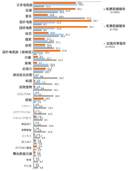從類別來看,國內外的電影、日劇、動漫的收費視頻收看比例高,另外免費視頻服務中,日劇、動漫、綜藝佔比較高。與此完全不同的是,以YouTube為代表的視頻共享平台上,音樂類別觀看比例最高,其次遊戲實況和攻略、試着做了◯◯等獨特類別也很受歡迎。