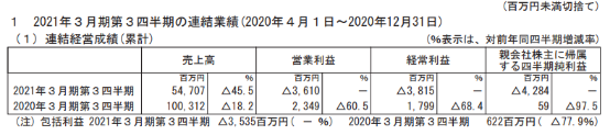 日本規模最大的唱片公司愛貝克思即艾迴,最新發布的2021年3月期第三季度累計(2020.4.1-2020.12.31)財務數據顯示,銷售額為547億700萬日元,同比減少45.5%,營業損失36億1000萬日元,上年同期盈利23億4900萬日元,經常利潤38億1500萬日元,上年同期盈利17億9900萬日元,最終損失42億8400萬日元,上年同期利潤5900萬日元。出現大幅減收和赤字。