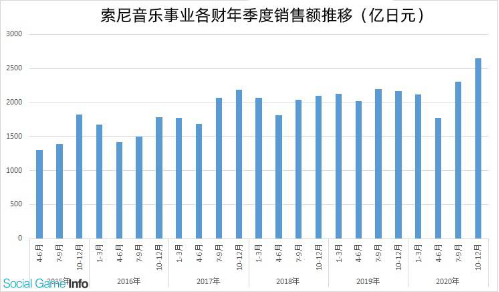 索尼在遊戲、音樂、電影、電子產品、金融等所有事業方面均實現了增收,整體趨勢向好。具體來看音樂事業,第三季度(2020.10-2020.12)銷售額同比增長21.9%,達到2645億日元,營業利潤同比增長64.5%,達到597億日元,實現了大幅度的增收增益。除了因火爆的《劇場版“鬼滅之刃”無限列車篇》帶動的動畫事業銷售額外,《Fate/Grand Order(FGO)》和《迪斯尼樂園》等手遊也是銷售額增長的一大原因。另外,在音樂製作和音樂出版方面,流媒體發佈的收入也有所提高。