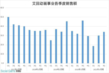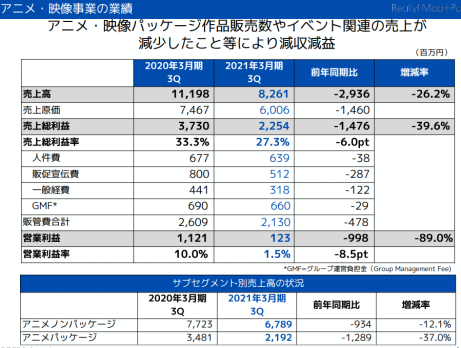 具體來看動畫業績,第三季度(2020.10-2020.12)銷售額為34億日元,去年同比減少26.6%,營業利潤2000萬日元,同比減少97%。除了因動畫、影像大碟銷量減少影像外,減收減益的主要原因還是在於線下演出活動的大規模減少導致活動關聯產品銷售額的鋭減。三季度艾迴發行了《那個瞬間,我很想哭-CINEMA FIGHTERS project-》《水果籃子第二季》《阿松第三季》等DVD、藍光碟。