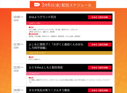 由於大面積取消公演活動,去年3月6日開始,吉本興業宣佈將每天免費直播全國各地的劇場演出,每天播出約12小時。配信內容除漫才、短劇、新喜劇、談話之外,還有寓教於樂節目。