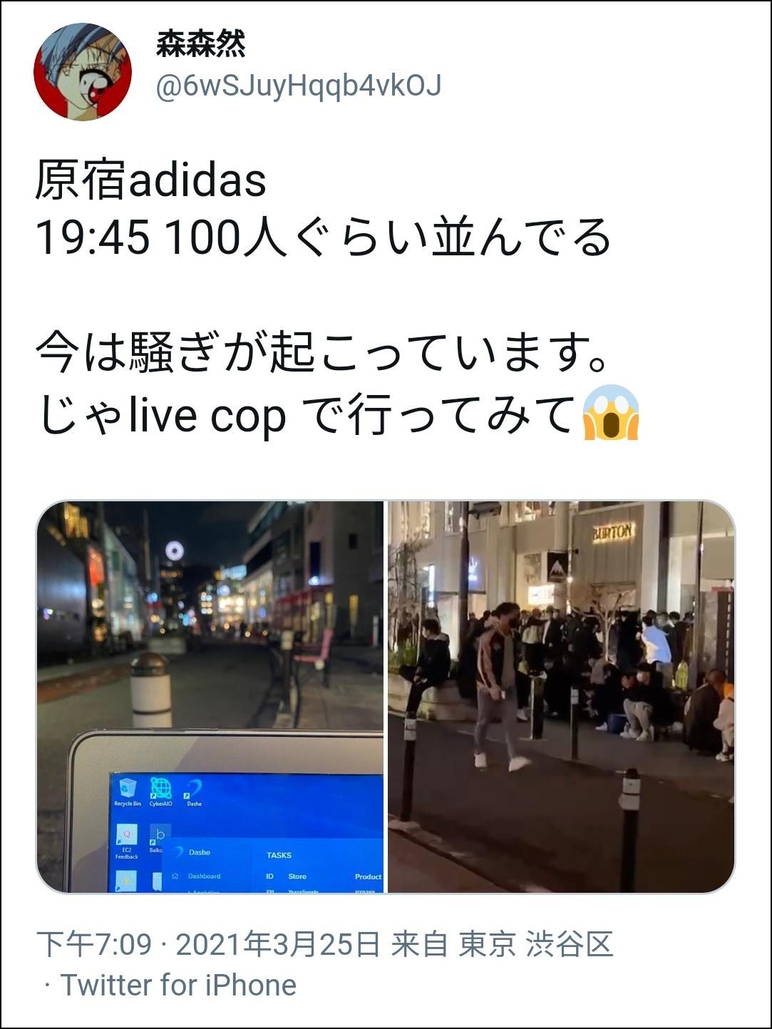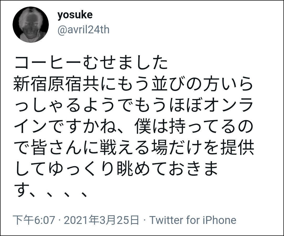 他還提到,“似乎新宿、原宿那邊已經有很多人在排隊了”。
