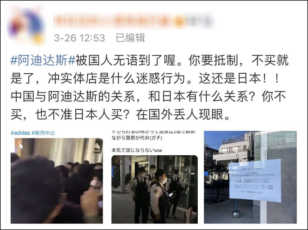 之前造謠中國年輕人在耐克中國區總部前抗議還不夠,3月26日,網上又有消息稱,生活在日本的中國人在“衝”當地的阿迪達斯門店,造成門店停止營業,被斥為“在國外丟人現眼”。然而經過反謠言中心查證,所謂的衝擊當地阿迪達斯門店完全子虛烏有,而是否為中國人也難以確定。