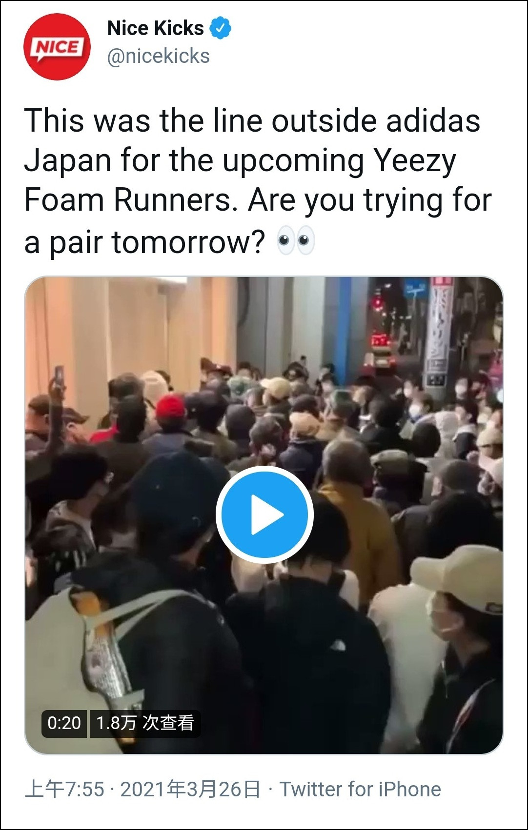 有網友預估,時間來到東京時間晚上7時45分,原宿阿迪達斯門店前排隊的人已經有100人以上。