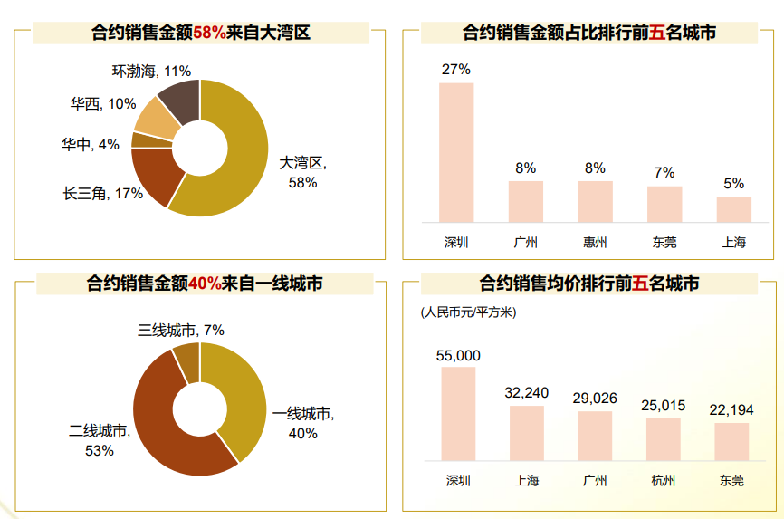 2020年佳兆業的合約銷售額中,大灣區為58%,長三角為17%,華西區域只有10%;而合約銷售金額佔比排行前五的城市是深圳、廣州、惠州、東莞和上海。