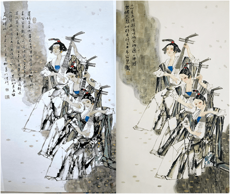 對比圖顯示,兩者的多幅畫除了題字和色調外幾乎一模一樣。