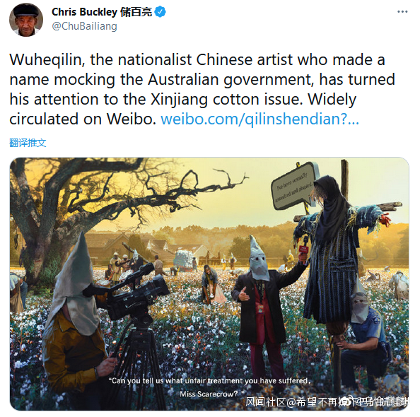 此前曾用“好鬥的民族主義”妖魔化中國人的《紐約時報》的前駐華記者儲百亮(Chris Buckley),也在個人推特上轉發了這張圖,玩得好一手“裝聾作啞”,只是稱@烏合麒麟 這回將注意力轉移到了新疆棉花問題。