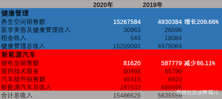 答案是:健康管理業務營收暴漲為2019年的三倍多,而新能源業務營收卻不足2019年的三分之一了。