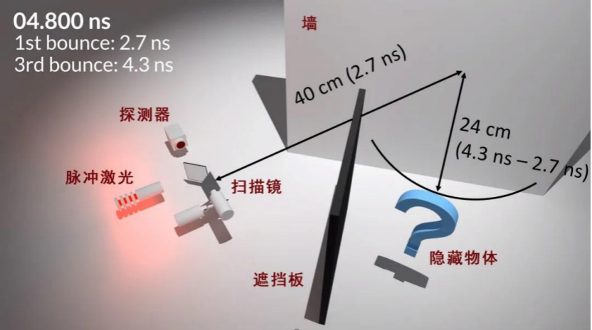 另一種是經過三次散射才回來的。比如説,它們跟出發時間隔4.3納秒。這又説明了什麼?這説明,它在4.3納秒的時間裏,走過了探測器到牆壁激光點距離的兩倍,再加上牆壁激光點到隱藏物體的距離的兩倍。由此可以算出,牆壁激光點到隱藏物體的距離是24釐米。