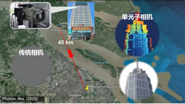 又如徐飛虎講過另一個跟隔牆觀物緊密關聯的技術,叫做“霧裏看花”(單光子相機:如何實現“霧裏看花” | 徐飛虎)。效果是在霧霾下仍然能對幾十公里外的物體成像,即超視距成像。那裏的技術關鍵,同樣是1550納米的單光子探測器。一個像素以前需要接收到十億個光子,而現在只需要接收到一個光子就行。