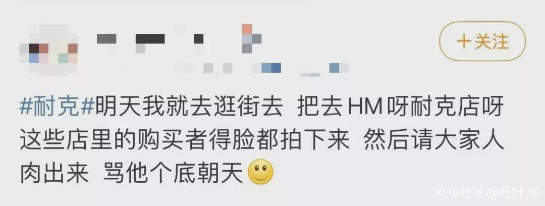 輿論也就漸漸變了味。既然燒掉、扔掉HM、耐克的人,都是深明大義的愛國者。那不扔還留着的人呢?肯定是“叛徒”。有人揚言,誰再買這些品牌,就把誰拍下來讓網友人肉,罵他個底朝天。