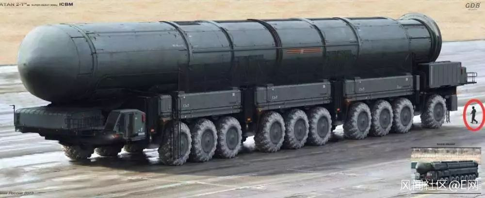 上面説的這些導彈起飛重量從30多噸到90噸,投擲重量最大到2.8噸,您可能覺得肯定已經不小了,畢竟美國現役的兩種洲際彈道導彈,潛射的三叉戟D5發射重量才59噸,投擲重量也是2.8噸,陸基的民兵3更小發射重量才34.5噸,投擲重量不到1噸。好吧,這些要麼是潛射導彈體積小重量輕,要麼歷史太久不代表美國的最高水平,80年代美國不是還有1款大殺器和平保衞者嗎,拉出來溜溜!很遺憾MX(和平保衞者)發射重量88.45噸,投擲重量也是3.95噸,和P-39就在伯仲間。不過MX並不是美國歷史上發射重量最大的洲際導彈,出門打聽一下大力神。拋出這些引子是為了引出今天的第一個主角,人類歷史上最大最重的洲際導彈P-36M(北約代號SS-18,綽號撒旦是對這種導彈的最好註解),還是現役的。