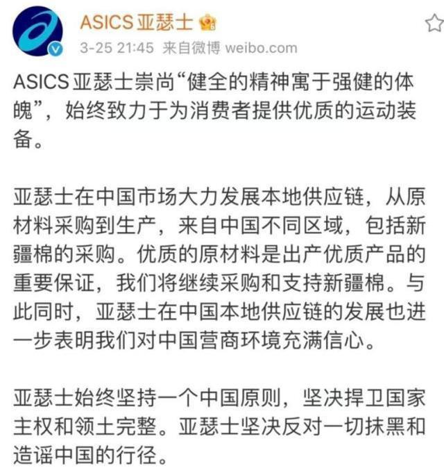 在上週一眾國際品牌接連發出“抹黑新疆棉花”的無理聲明中,日本運動品牌亞瑟士本是一股清流,在官方微博上獨樹一幟支持新疆棉花。