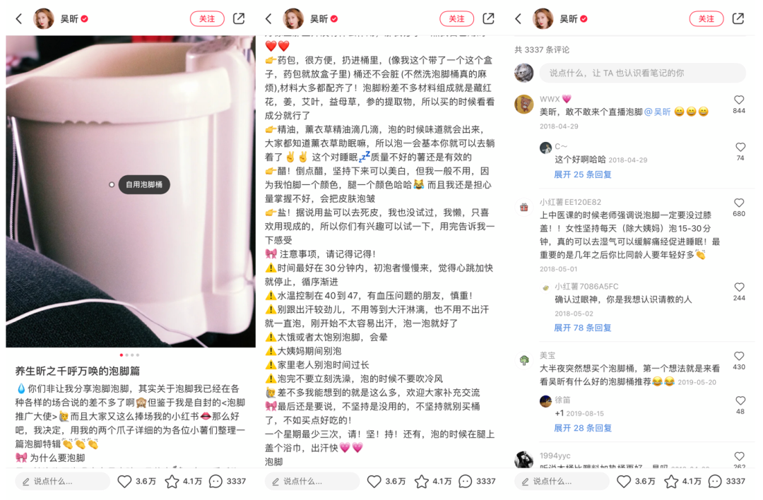 此前,吳昕曾在小紅書分享了近千字的“泡腳合集”,深入探討“為什麼要泡腳”,詳細講解過藥包、精油、粗鹽的泡腳功效,還貼心列出七大注意事項。這則筆記獲得3.6萬點贊,4.1萬收藏,粉絲、路人紛紛變身泡腳達人。