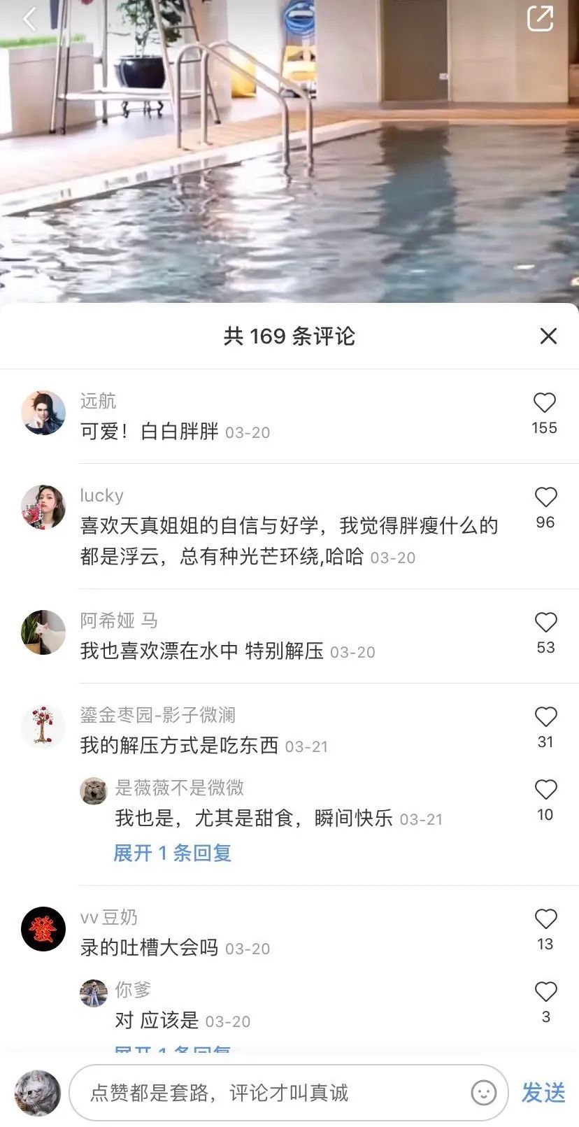 楊天真喜歡在小紅書曬生活照,這些內容常被搬運到其他平台,遭受“油膩”“辣眼睛”的嘲諷。然而,追求審美多元的小紅書用户,卻總能發現楊天真的閃光之處,留下“可愛!白白胖胖”“胖瘦都是浮雲”“喜歡你的自信”等暖心評論。