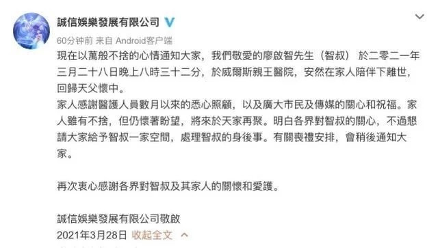 經紀公司發文稱,“現在以萬般不捨的心情通知大家,我們敬愛的廖啓智先生(智叔) 於二零二一年三月二十八日晚上八時三十二分,於威爾斯親王醫院,安然在家人陪伴下離世,迴歸天父懷中。家人感謝醫護人員數月以來的悉心照顧,以及廣大市民及傳媒的關心和祝福。家人雖有不捨,但仍懷著盼望,將來於天家再聚。明白各界對智叔的關心,不過懇請大家給予智叔一家空間,處理智叔的身後事。有關喪禮安排,會稍後通知大家。再次衷心感謝各界對智叔及其家人的關懷和愛護。”