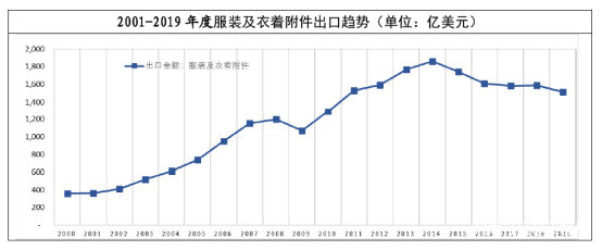 2001-2019年度服裝及衣着附件出口趨勢(單位:億美元)