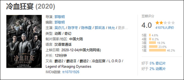 郭敬明(《晴雅集》《冷血狂宴》):《冷血狂宴》全CG特效夠新鮮但掩蓋不了它的不倫不類與粗製濫造,所謂羣星出演只不過是3D建模後虛擬人物的簡單換臉,毫無層次,千篇一律。