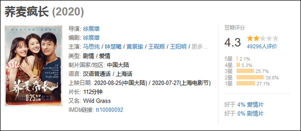 《蕎麥瘋長》:對現實情感充滿誤解,情感缺乏劇情基礎。用文藝腔講述狗血的故事,令人錯愕的段落比比皆是。