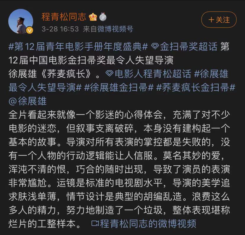 徐展熊(《蕎麥瘋長》):導演對所有表演的掌控都是失敗的,沒有一個人物的行動邏輯能讓人信服。導演的美學追求膚淺單薄,情節設計是典型的胡編亂造。