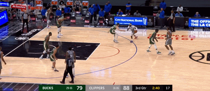 很有趣的是,雄鹿站了一個聯防,面對快船這個人人都能投三分的陣容,雄鹿竟然敢守聯防?