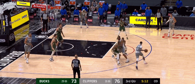 今天比賽的第二個轉折點在第三節後半段,5分半的暫停回來,快船上了一個雷吉+肯納德+萊昂納德+小莫里斯+巴圖姆的五小陣容,雄鹿則依然把大洛擺在場上。