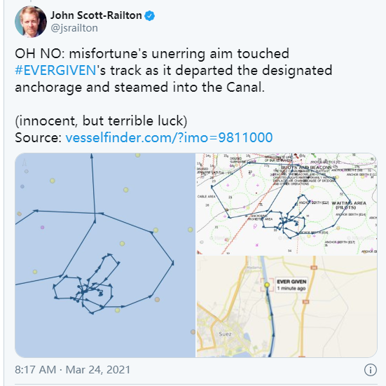 “長賜”擱淺的3月23日,早上趕巧天氣不好,有強風和沙塵暴,而“長賜”所在的河道又偏偏是蘇伊士運河最窄的地方,,“長賜”在經過這個河段時不幸全船跳電,又被強風吹得船體失控偏離航道,直接把航道堵死,真是倒黴到家了。