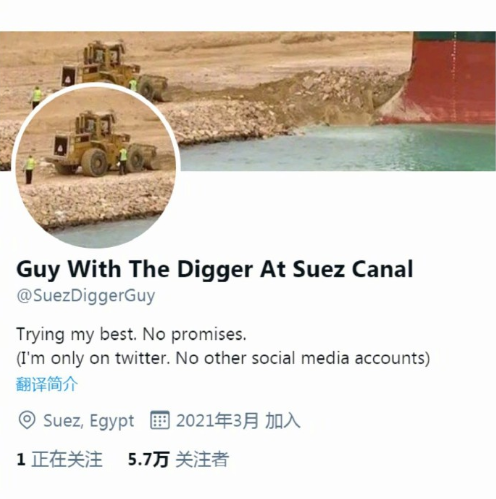 要説這件事兒裏出風頭最大的,其實不是埃及政府,而是當時被派去開挖掘機清除淤泥的小哥,這位兄弟害開通的推特,ID更是簡單明瞭,“蘇伊士運河那兒開挖土機的”,下面的備註也很實誠,“我盡全力,不做承諾”。